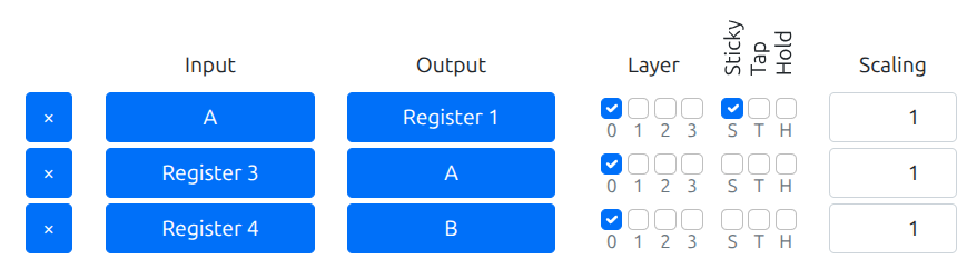 I wanted a repeating output of multiple characters from one input. I modified this for my purposes by changing the the second mapping input Register from 4 to 3. If I tap A, I get abababab…, but not toggling a-b-a-b…, it outputs ab-ab-ab… which is just what I want. I changed my output characters, of course.