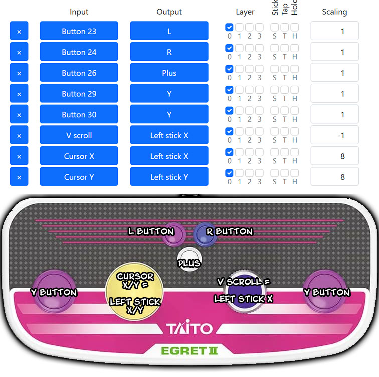 Specifically, I’m trying to use a Taito Egret II Mini Paddle & Trackball controller on the Switch to play Arcade Archives Puzzle Bobble. The controller has a trackball and spinner wheel which maps to Cursor X/Cursor Y and V scroll respectively, meanwhile Puzzle Bobble only accepts D-pad or Left Stick inputs for movement. I’ve been able to map the trackpad and wheel as D-pad inputs, so the adapter is working though. They just don’t seem to work as Left or Right analog sticks.